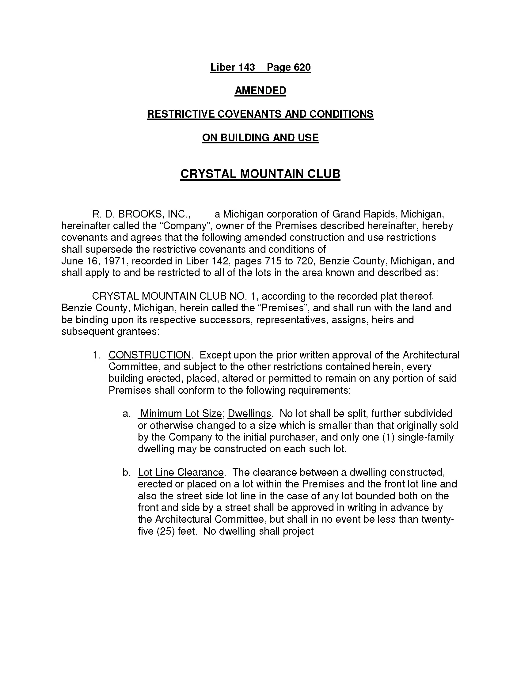 In order to promote and maintain the aesthetic beauty and functional value of properties within the Crystal Mountain Club, there are restrictive covenants and conditions for building and use within the club. A PDF copy of the current Covenants and Conditions is available here or by clicking the image.